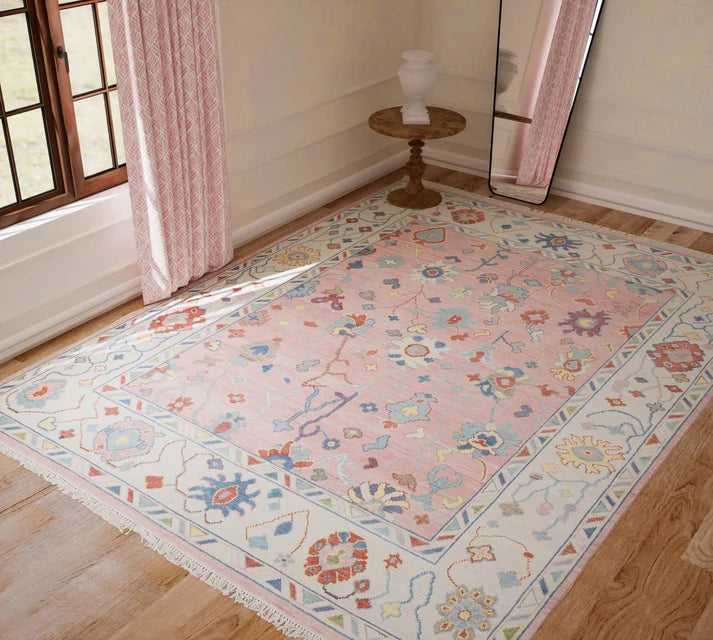 سجادة أوشاك زرقاء مقاس 6 × 9 للحضانة، سجادة من الصوف المرجاني البحري مع لمسات من الفحم، سجادة تركية حديثة سريعة الشحن: سجادة منطقة باللون الوردي والأزرق